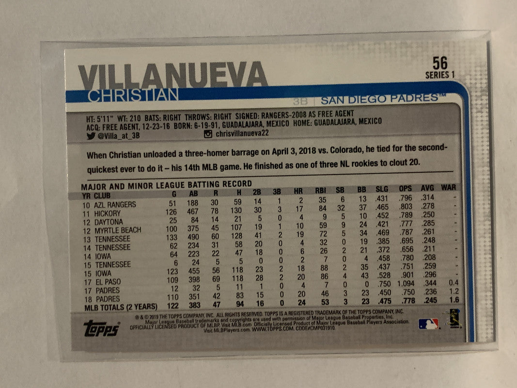 #56 Christian Villanueva San Diego Padres 2019 Topps Series One Baseball Card