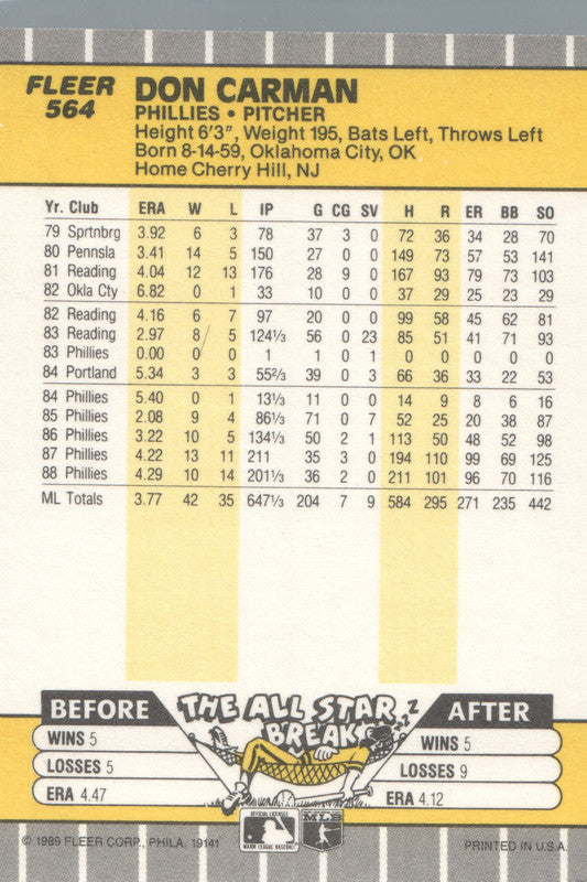 #564 Don Carman Philadelphia Phillies 1989 Fleer Baseball Card OF