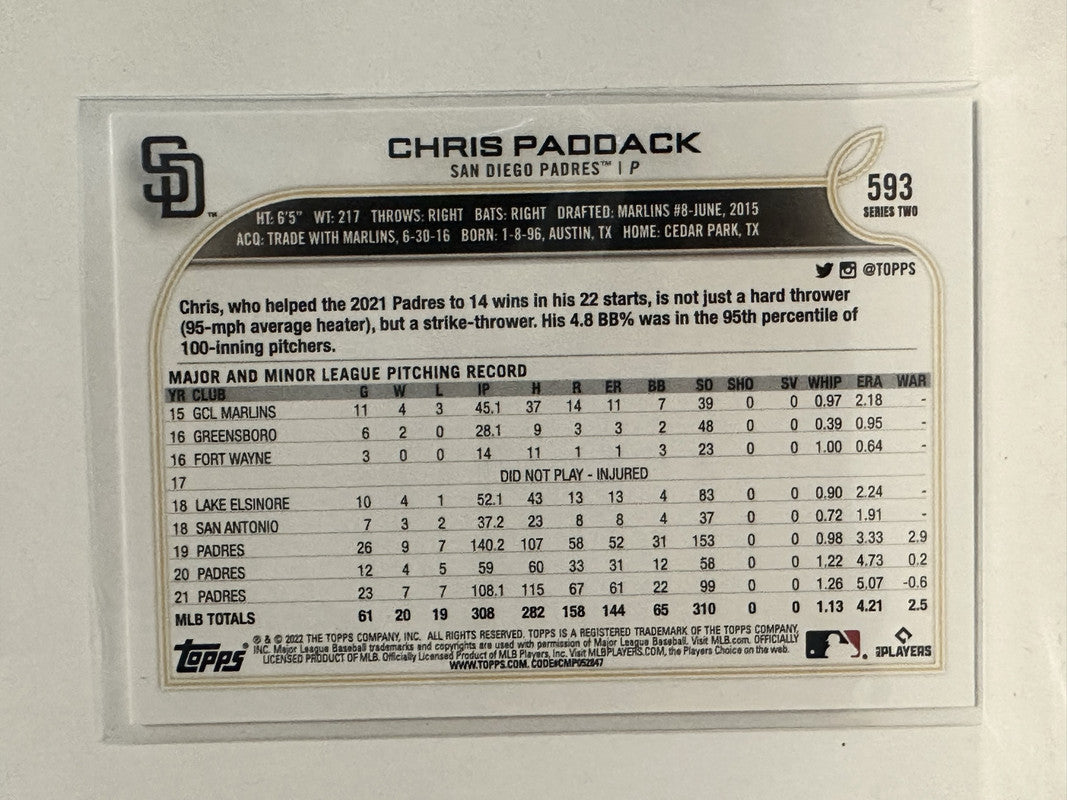 #593 Chris Paddack San Diego Padres 2022 Topps Series Two Baseball Card