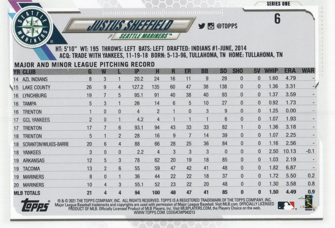 #6 Justus Sheffield Seattle Mariners 2021 Topps Series 1 Baseball Card
