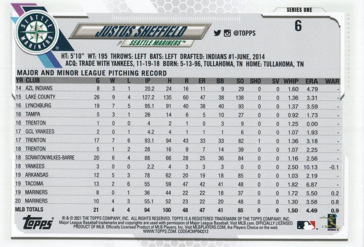 #6 Justus Sheffield Seattle Mariners 2021 Topps Series 1 Baseball Card