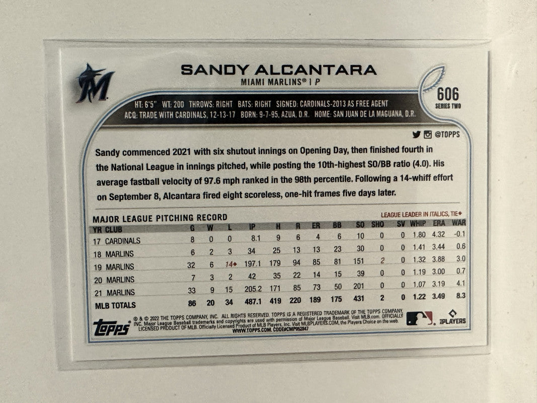 #606 Sandy Alcantara Miami Marlins 2022 Topps Series Two Baseball Card