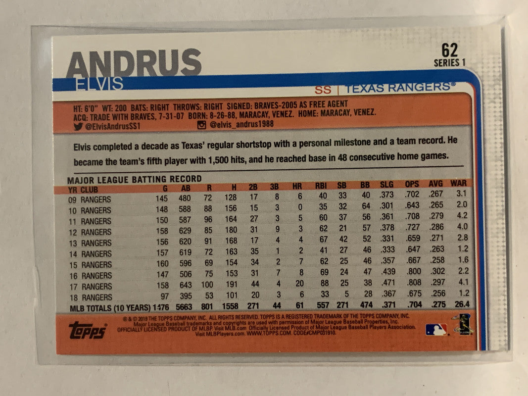 #62 Elvis Andrus Texas Rangers 2019 Topps Series One Baseball Card