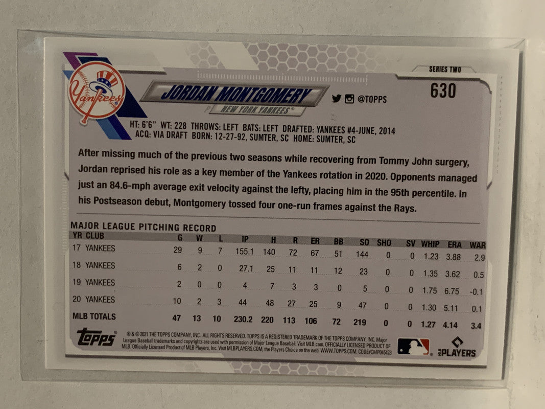 #630 Jordan Montgomery New York Yankees 2021 Topps Series 2 Baseball Card