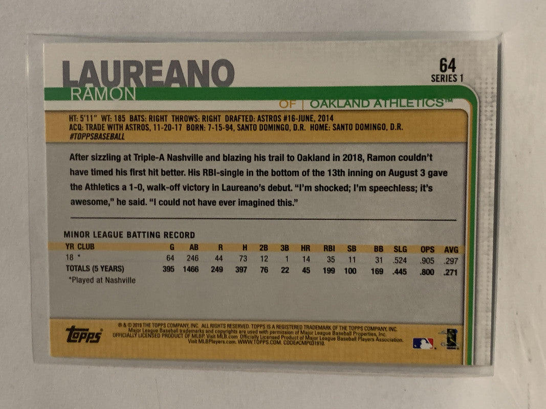 #64 Ramon Laureano Rookie Oakland Athletics 2019 Topps Series One Baseball Card