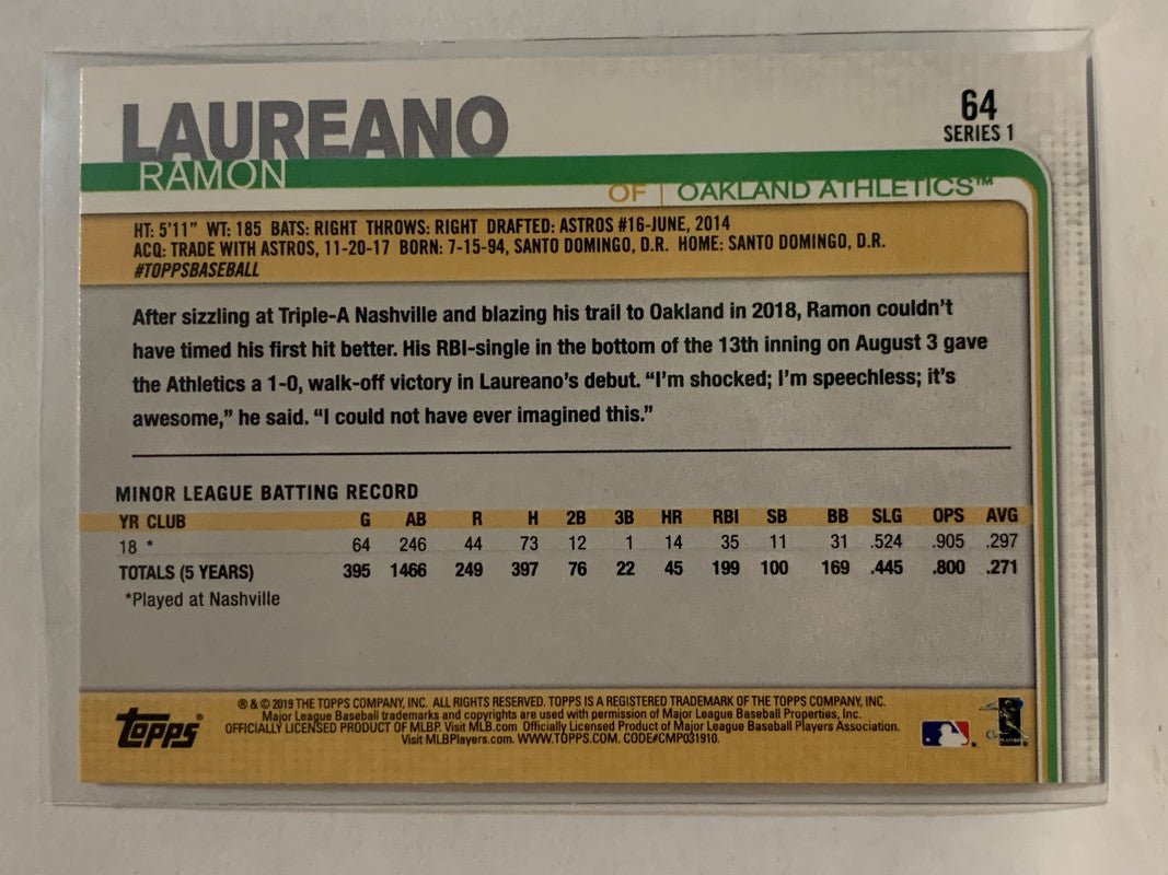 #64 Ramon Laureano Rookie Oakland Athletics 2019 Topps Series One Baseball Card
