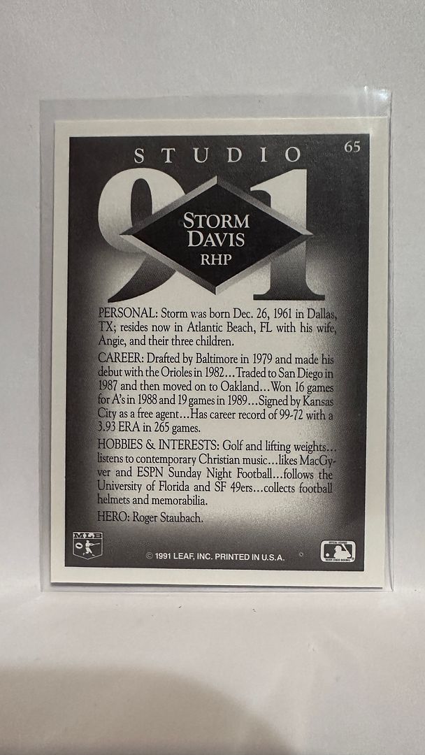 #65 Strom Davis Kansas City Royals 1991 Studio Baseball Card