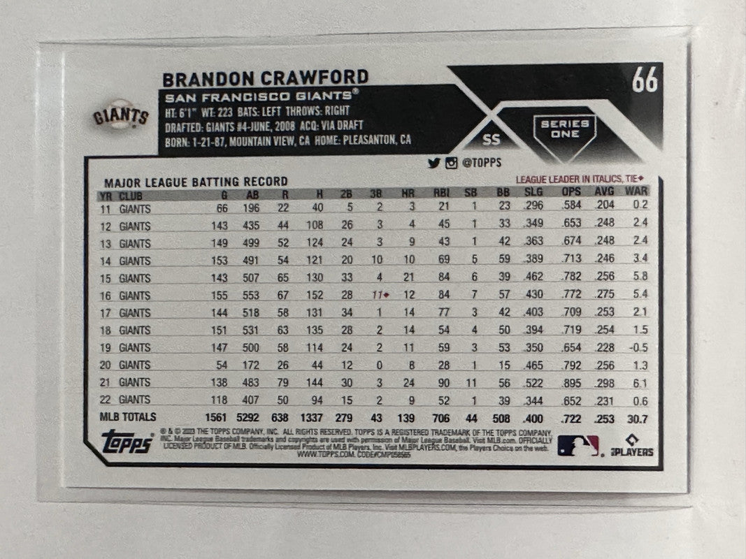 #66 Brandon Crawford San Francisco Giants 2023 Topps Series One Baseball Card