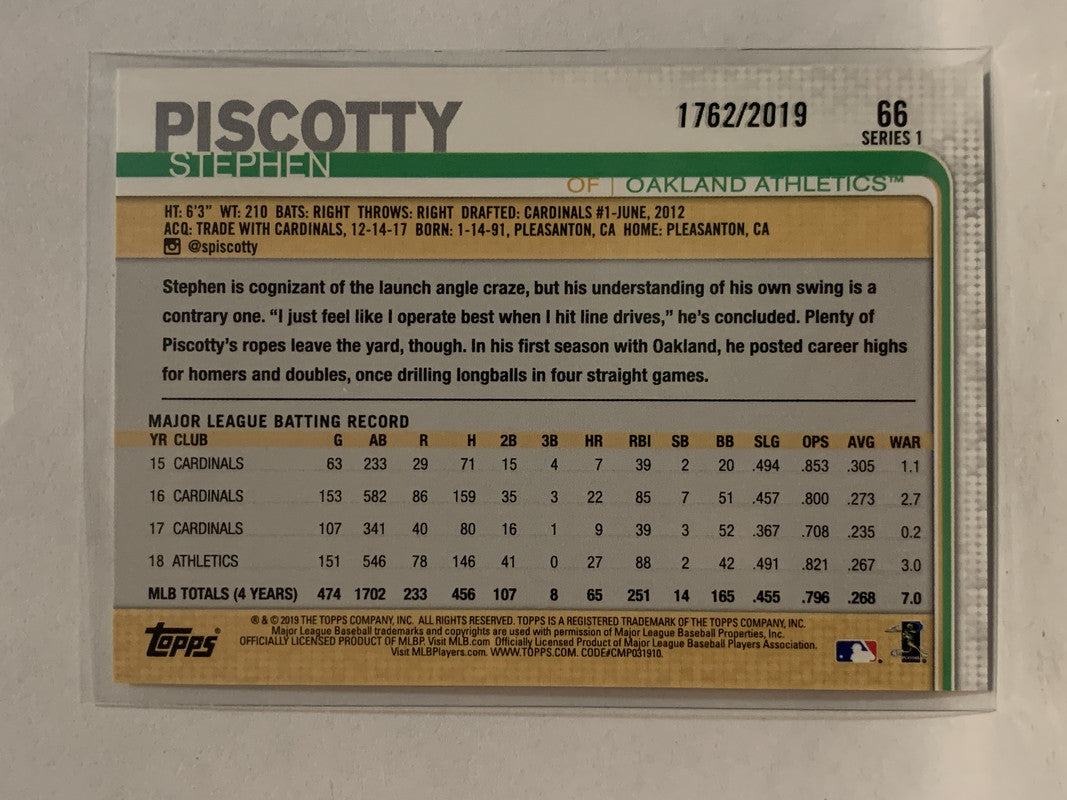 #66 Stephen Piscotty 1762/2019 Oakland Athletics 2019 Topps Series One Baseball Card