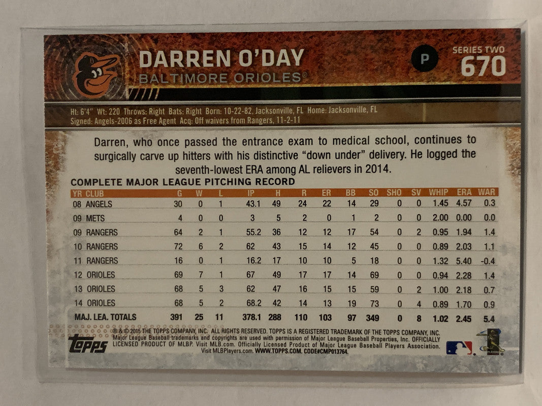 #670 Darren O'Day Baltimore Orioles 2015 Topps Series two Baseball Card