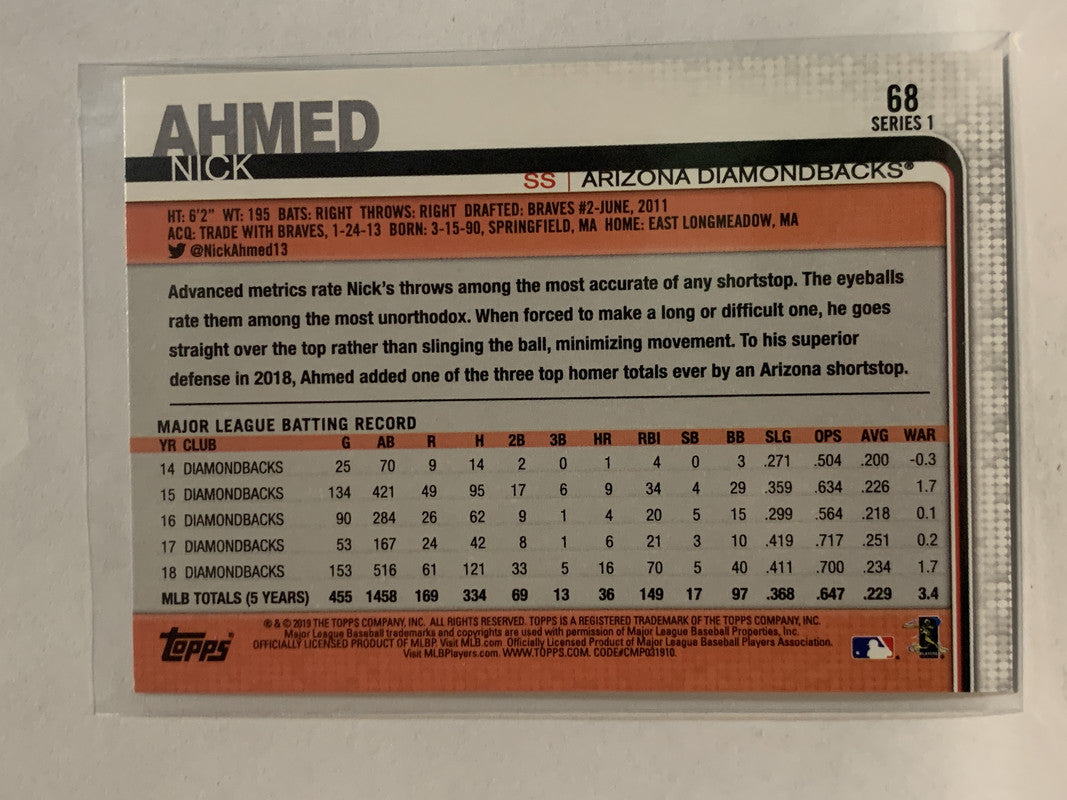 #68 Nick Ahmed Arizona Diamondbacks 2019 Topps Series One Baseball Card