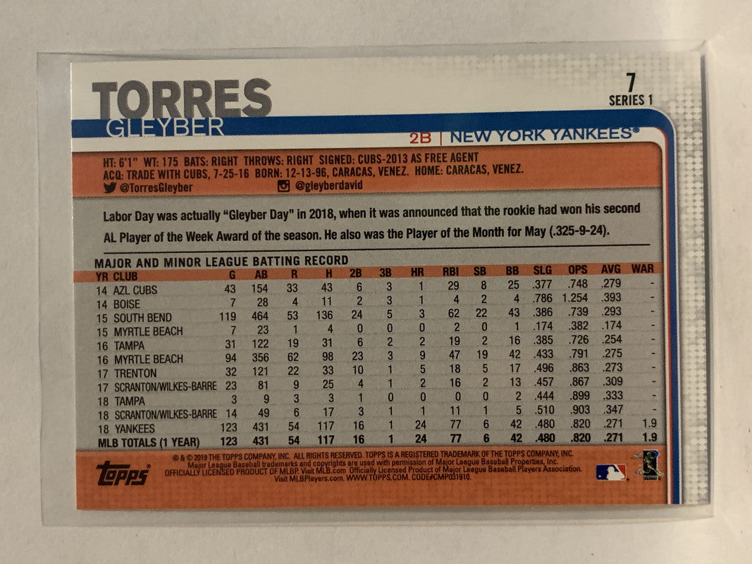 #7 Gleyber Torres All Star Rookie New York Yankees 2019 Topps Series One Baseball Card