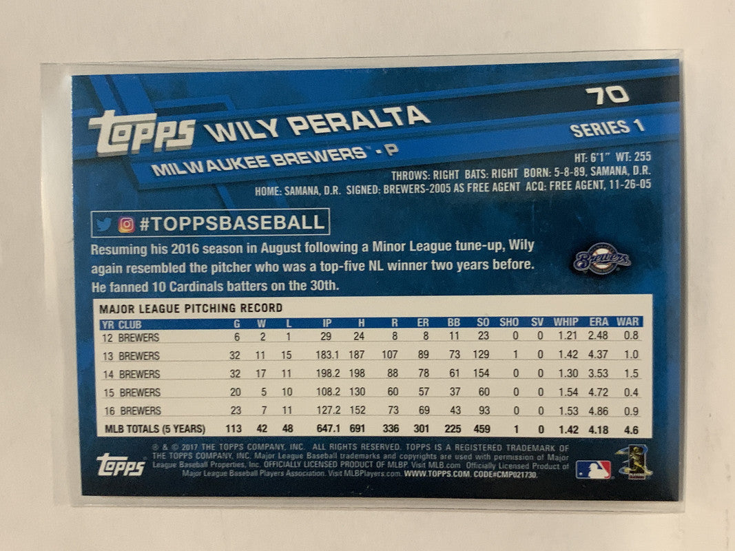 #70 Wily Peralta Milwaukee Brewers 2017 Topps Series One Baseball Card