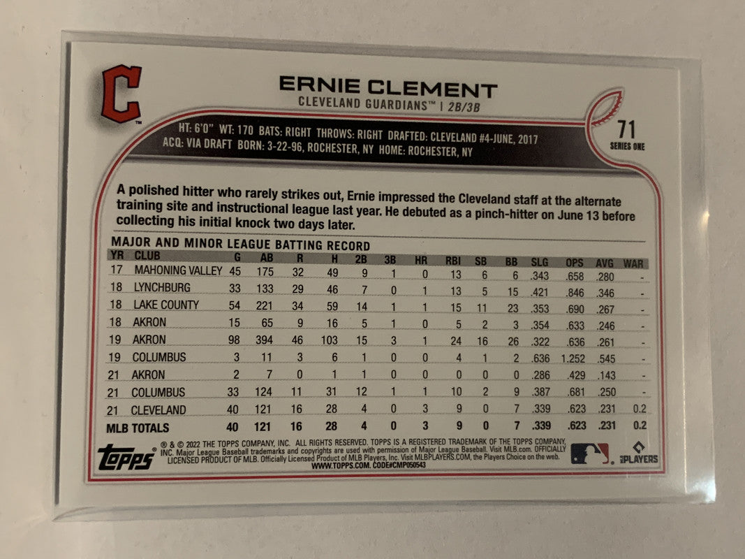 #71 Ernie Clement Rookie Cleveland Guardians 2022 Topps Series 1 Baseball Card MLB