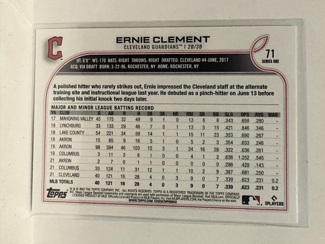 #71 Ernie Clemont Rookie Cleveland Guardians 2022 Topps Series One Baseball Card
