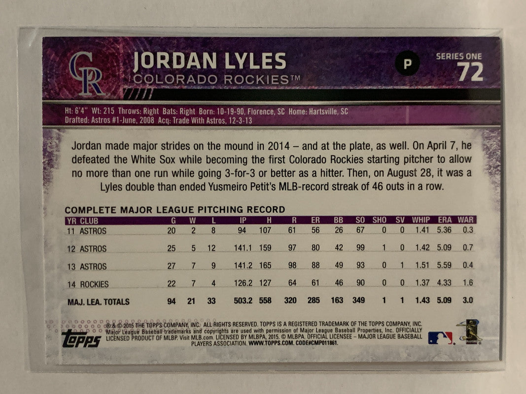 #72 Jordan Lyles Colorado Rockies 2015 Topps Series One Baseball Card