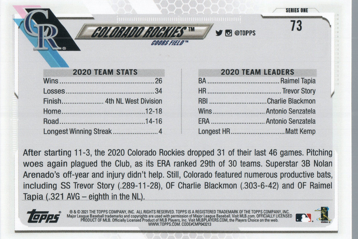 #73 Coors Field Colorado Rockies 2021 Topps Series 1 Baseball Card