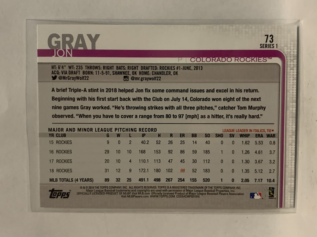 #73 Jon Gray 150th Colorado Rockies 2019 Topps Series One Baseball Card