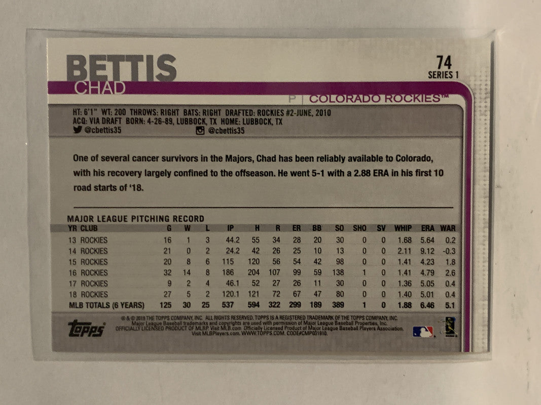 #74 Chad Bettis Colorado Rockies 2019 Topps Series One Baseball Card