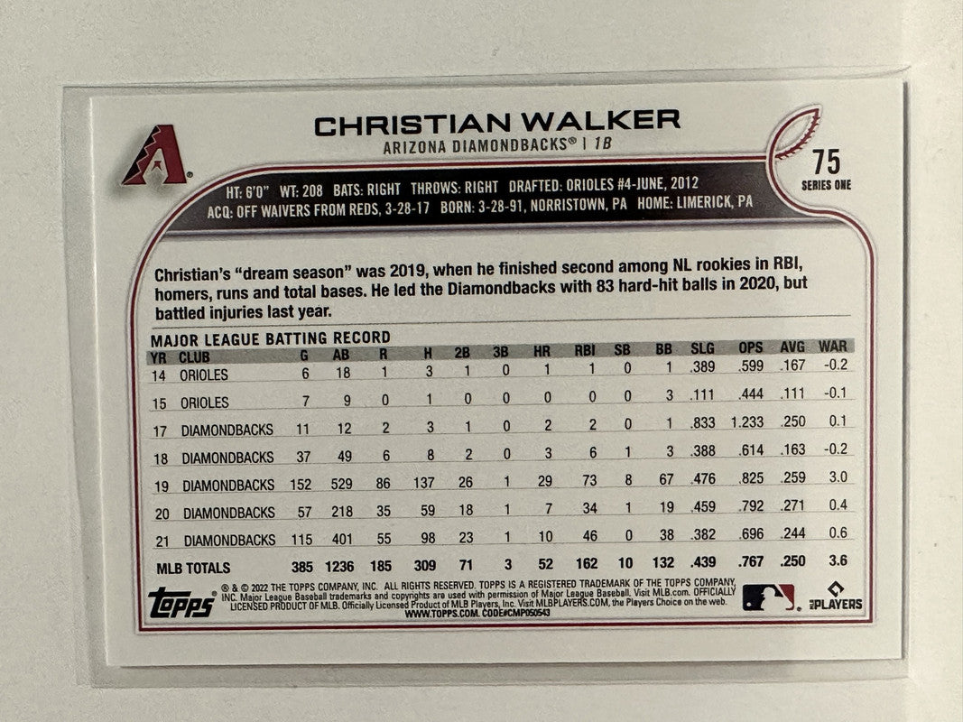#75 Christian Walker Arizona Diamondbacks 2022 Topps Series One Baseball Card
