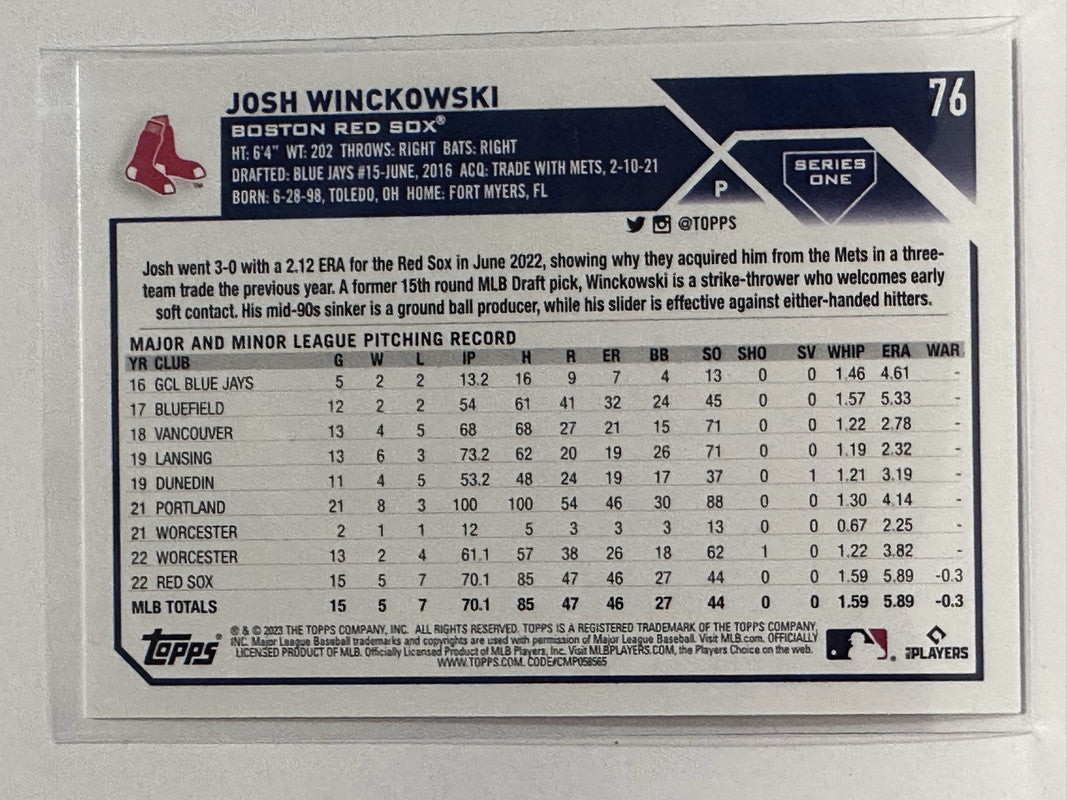 #76 Josh Winckowski Rookie Boston Red Sox 2023 Topps Series One Baseball Card