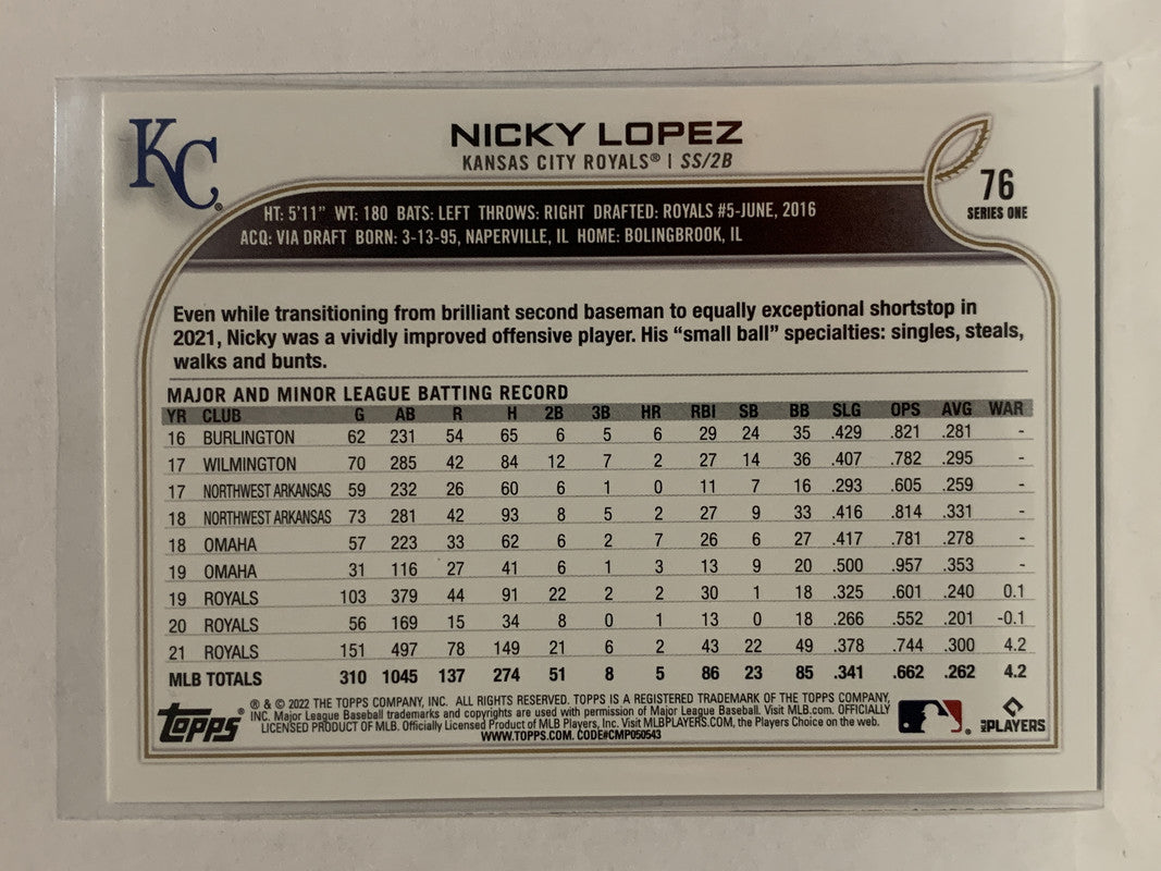 #76 Nicky Lopez Kansas City Royals 2022 Topps Series One Baseball Card MLB