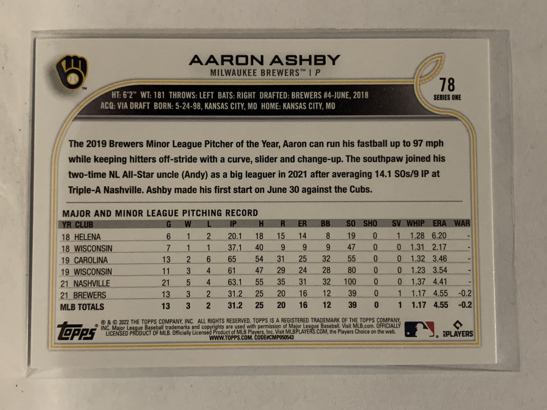 # 78 Aaron Ashby Rookie Milwaukee Brewers 2022 Topps Series 1 Baseball Card