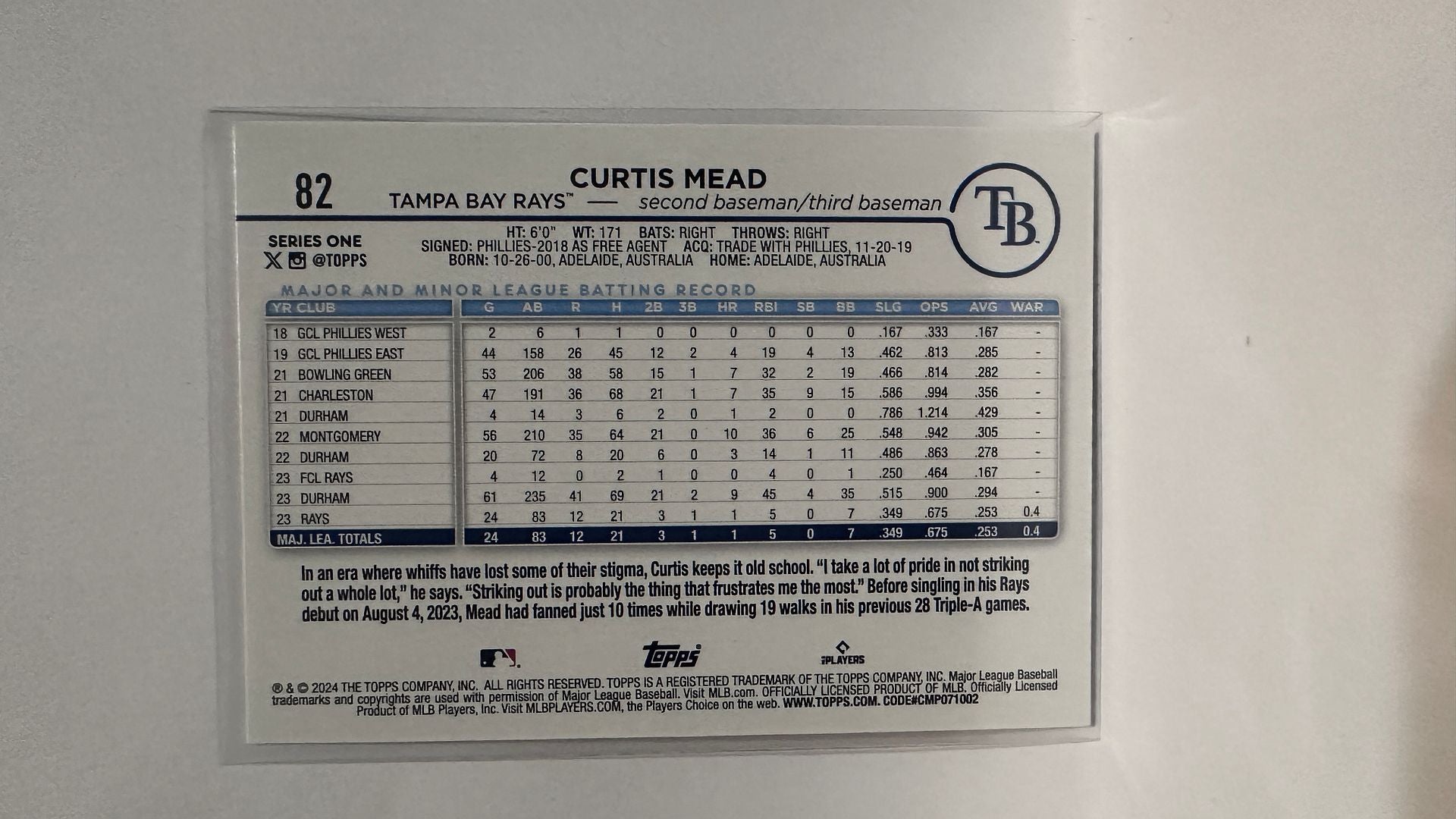 #82 Curtis Mead Rookie Tampa Bay Rays 2024 Topps Baseball Card