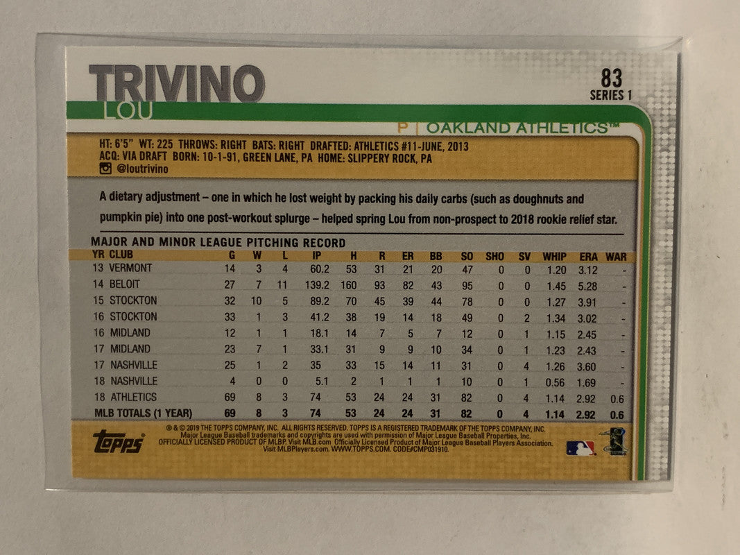 #83 Lou Trivino Oakland Athletics 2019 Topps Series One Baseball Card