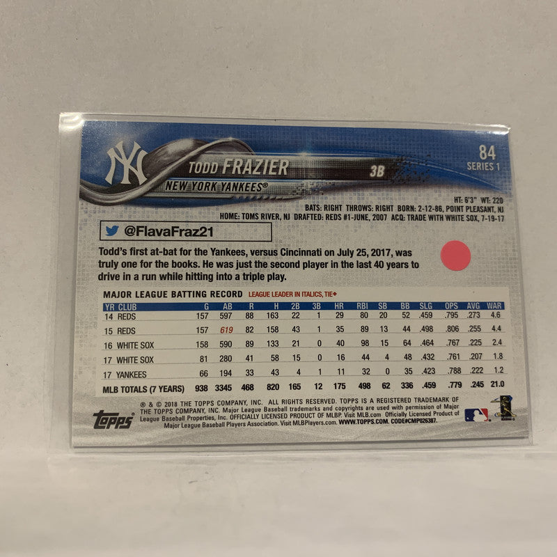 #84 Todd Frazier New York Yankees Series 1 2018 Topps Baseball Card A1U