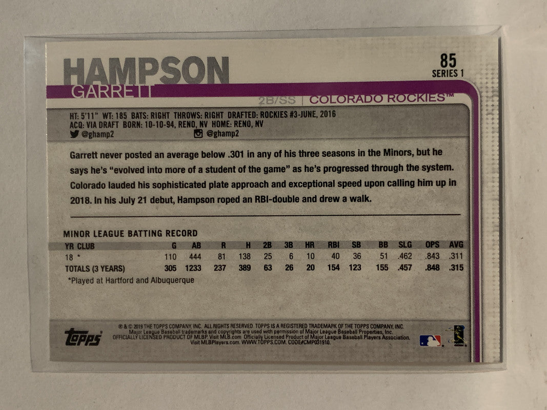 #85 Garrett Hampson Rookie Colorado Rockies 2019 Topps Series One Baseball Card