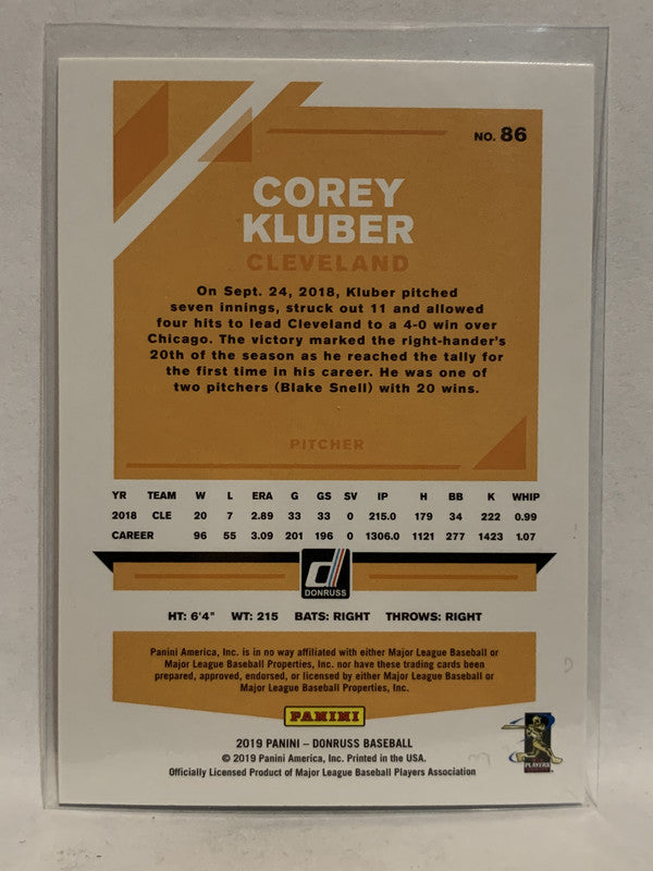 #86 Corey Kluber Cleveland Indians 2019 Donruss Baseball Card