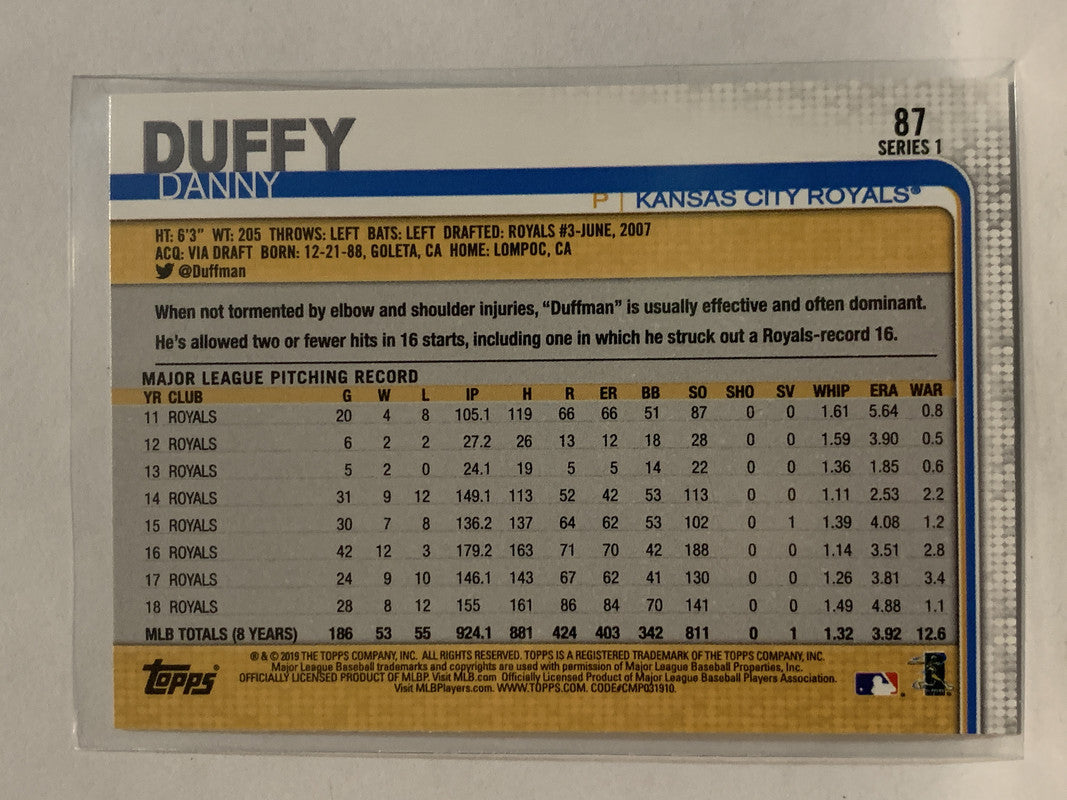 #87 Danny Duffy Kansas City Royals 2019 Topps Series One Baseball Card