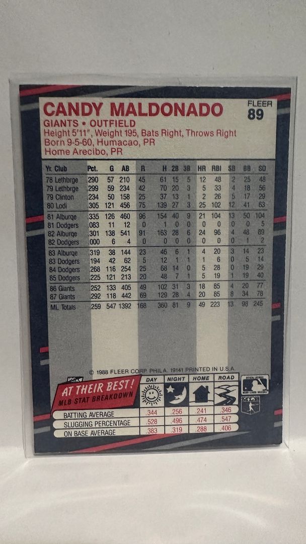 #89 Candy Maldonado SAN Francisco Giants 1988 Fleer Baseball Card