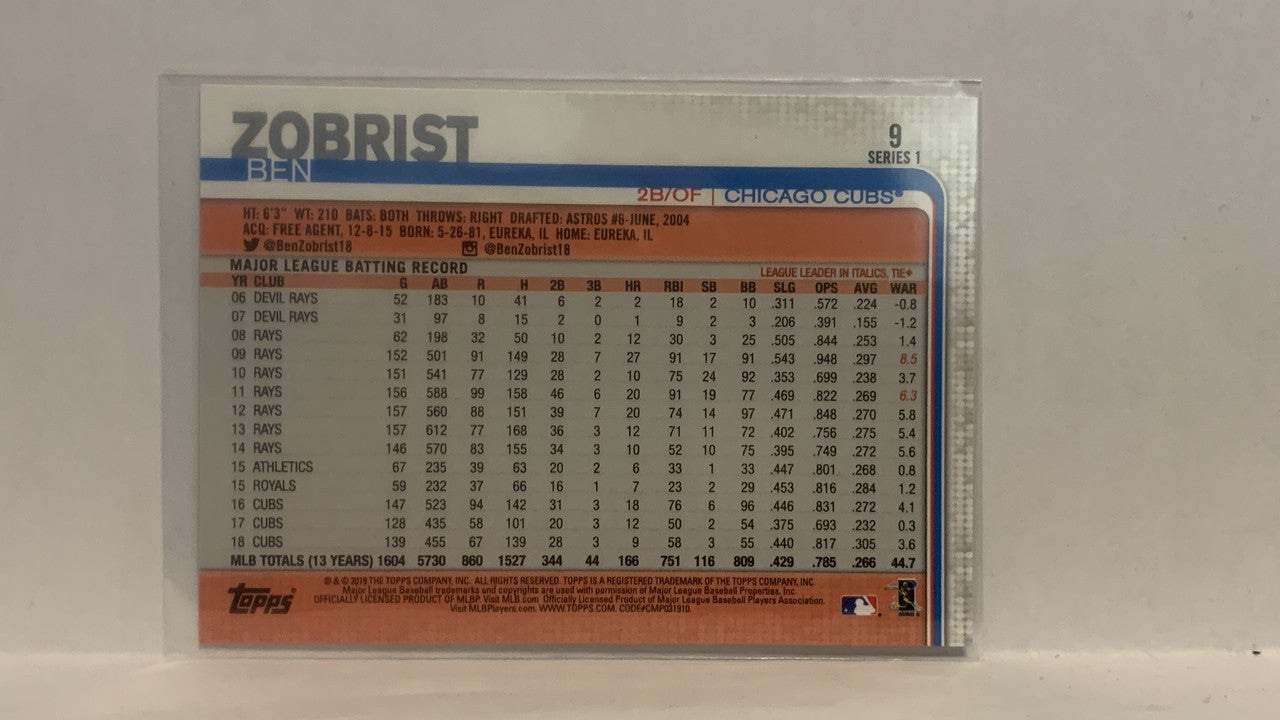 #9 Ben Zobrist Chicago Cubs 2019 Topps Series 1 Baseball Card