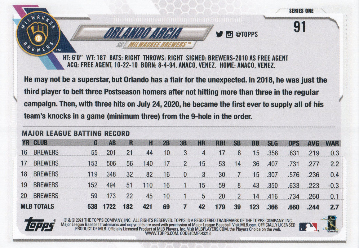 #91 Orlando Arcia Milwaukee Brewers 2021 Topps Series 1 Baseball Card