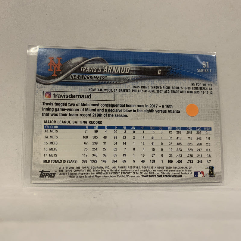 #91 Travis D'Arnaud New York Mets Series 1 2018 Topps Baseball Card A1U