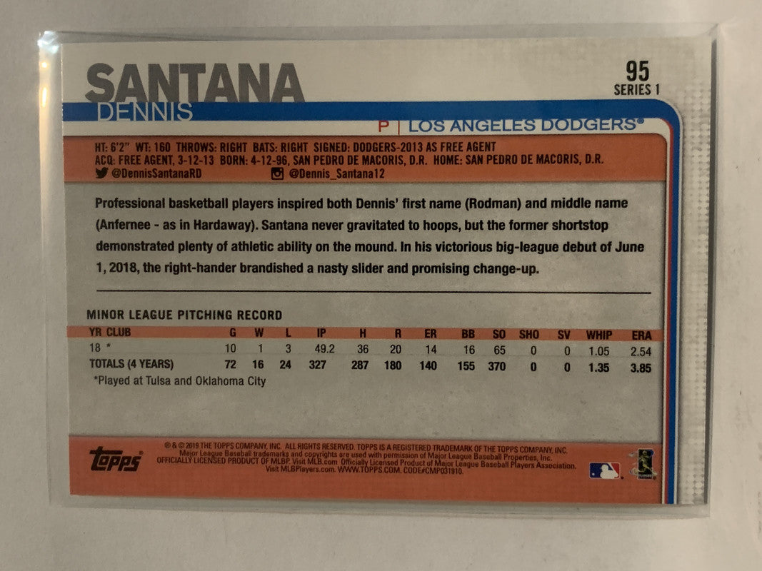 #95 Dennis Santana Rookie Los Angeles Dodgers 2019 Topps Series One Baseball Card