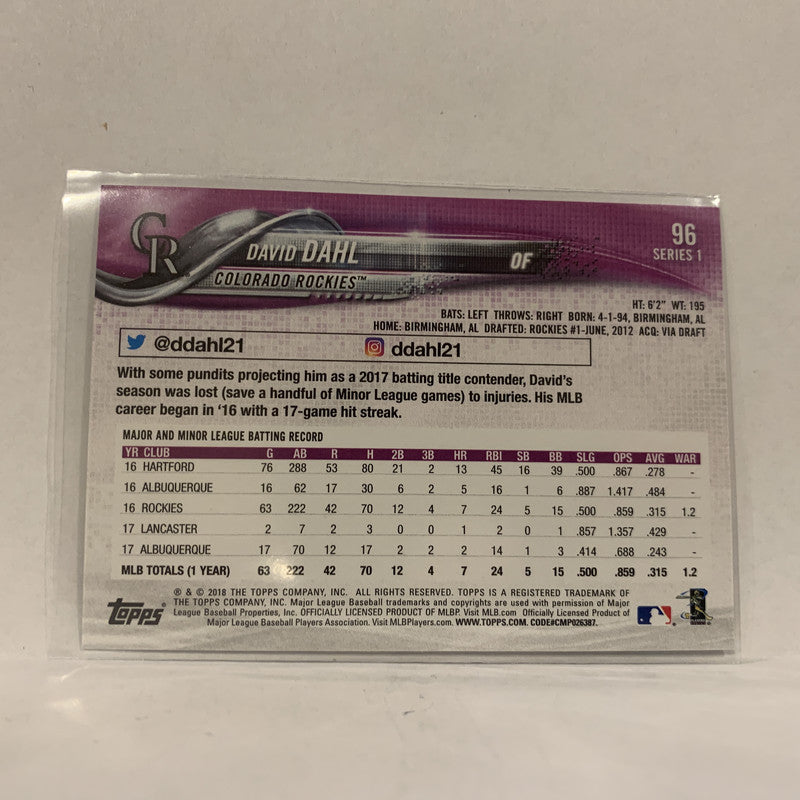 #96 David Dahl Colorado Rockies Series 1 2018 Topps Baseball Card A2A