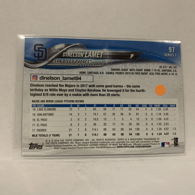 #97 Dinelson Lamet San Diego Padres Series 1 2018 Topps Baseball Card A1U
