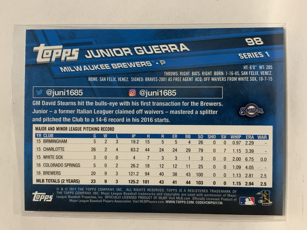 #98 Junior Guerra Milwaukee Brewers 2017 Topps Series One Baseball Card