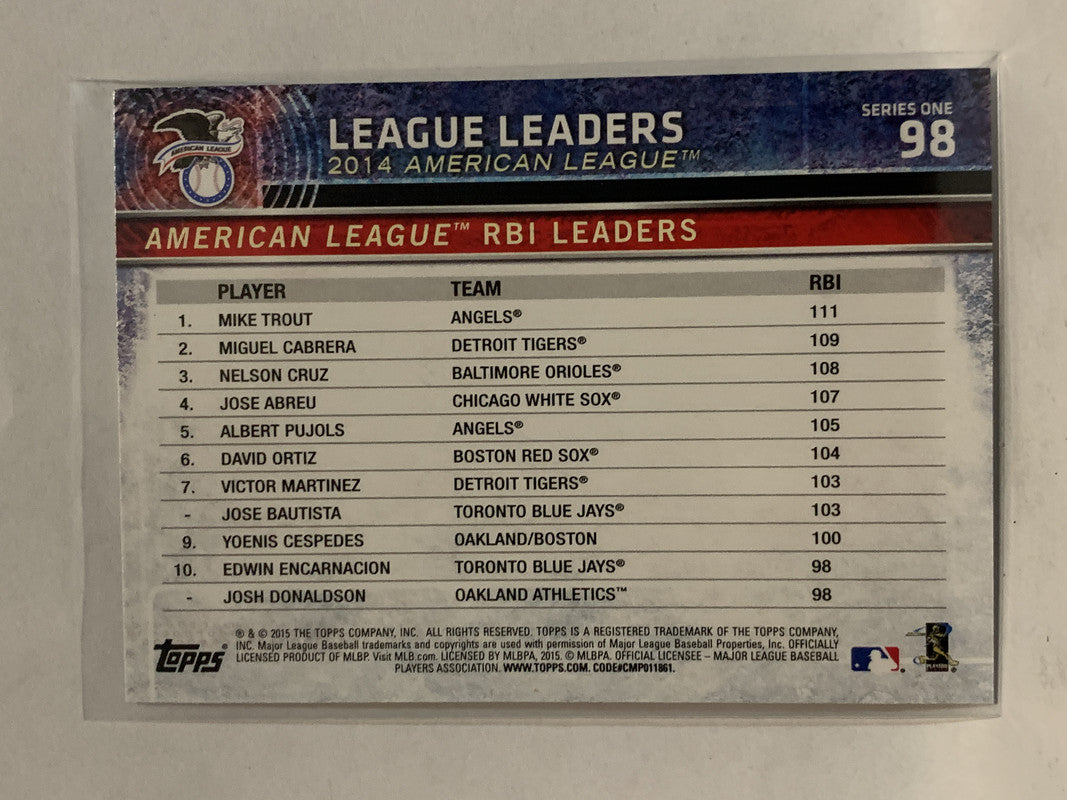 # 98 Trout Cabrera Cruz RBI Leaders 2015 Topps Series One Baseball Card