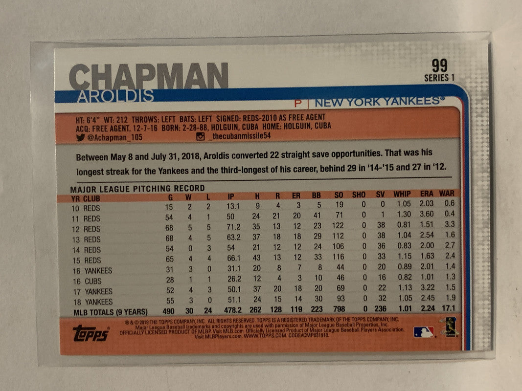 #99 Aroldis Chapman New York Yankees 2019 Topps Series One Baseball Card