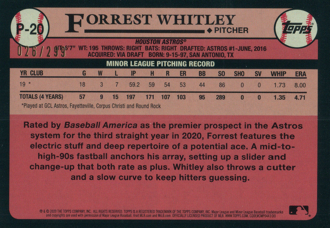 P-20 Forrest Whitley 026/299 Houston Astros 2020 Topps Update Baseball Card