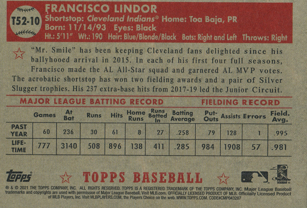 T52-10 Francisco Lindor Cleveland Indians 2021 Topps Series 1 Baseball Card