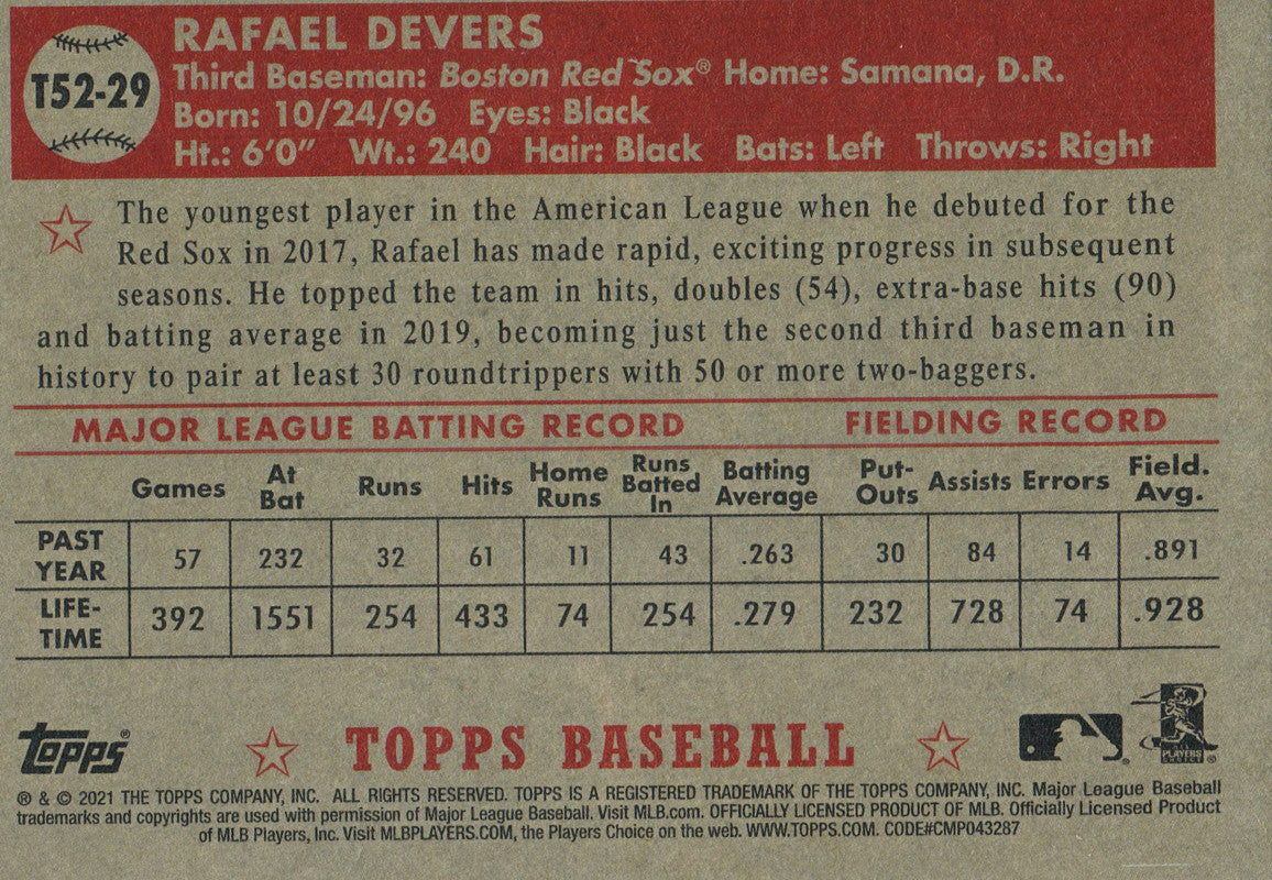 T52-29 Rafael Devers Boston Red Sox 2021 Topps Series 1 Baseball Card