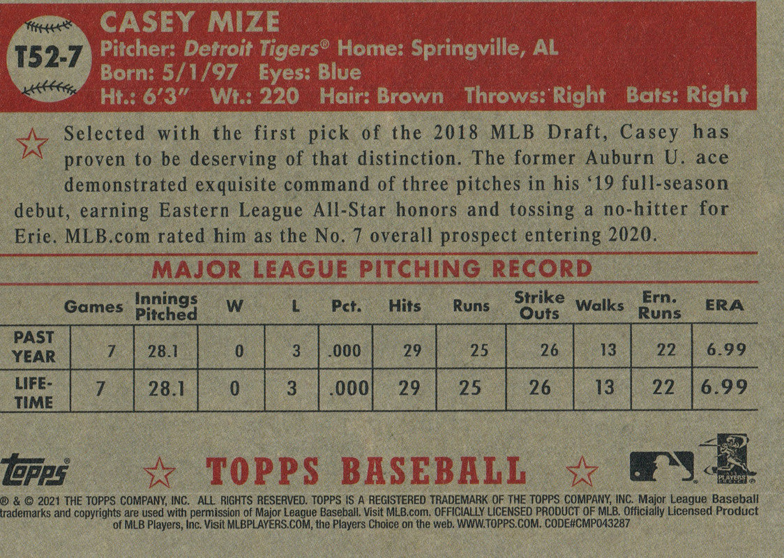 T52-7 Casey Mize Rookie Detroit Tigers 2021 Topps Series 1 Baseball Card