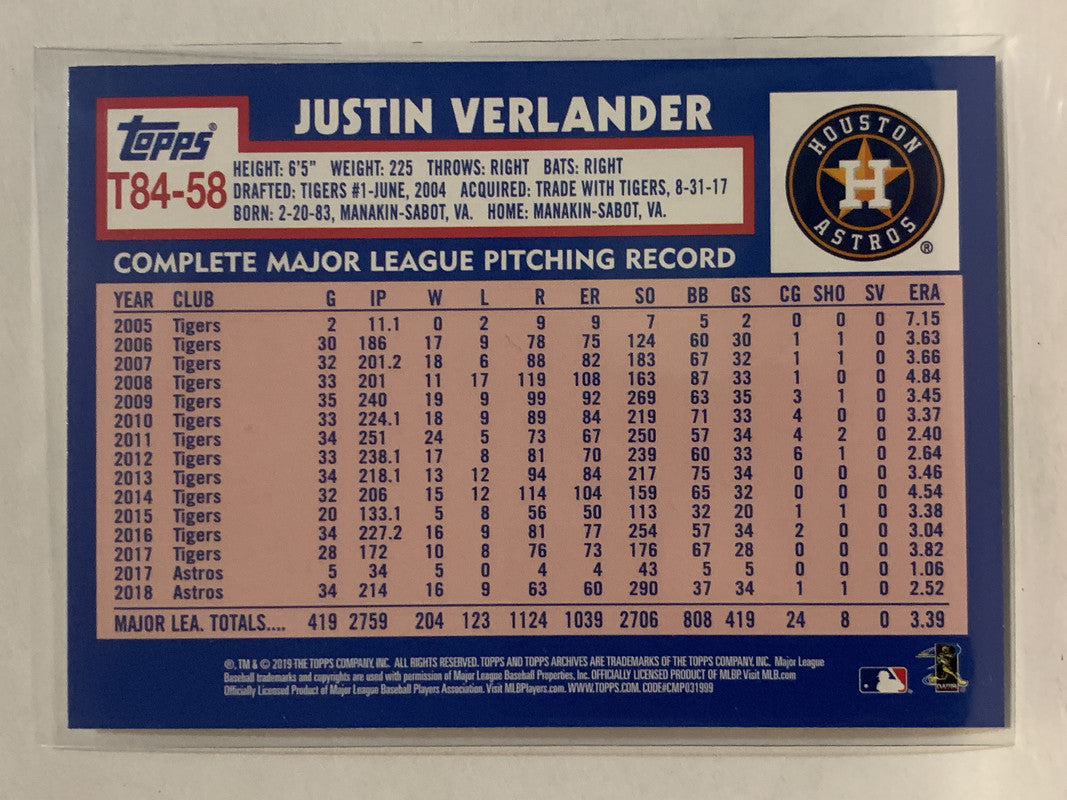 #T84-58 Justin Verlander Houston Astros 2019 Topps Series One Baseball Card