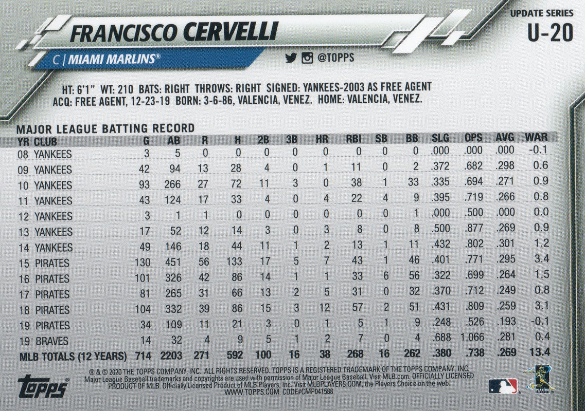 U-20 Francisco Cervelli Miami Marlins 2020 Topps Update Baseball Card