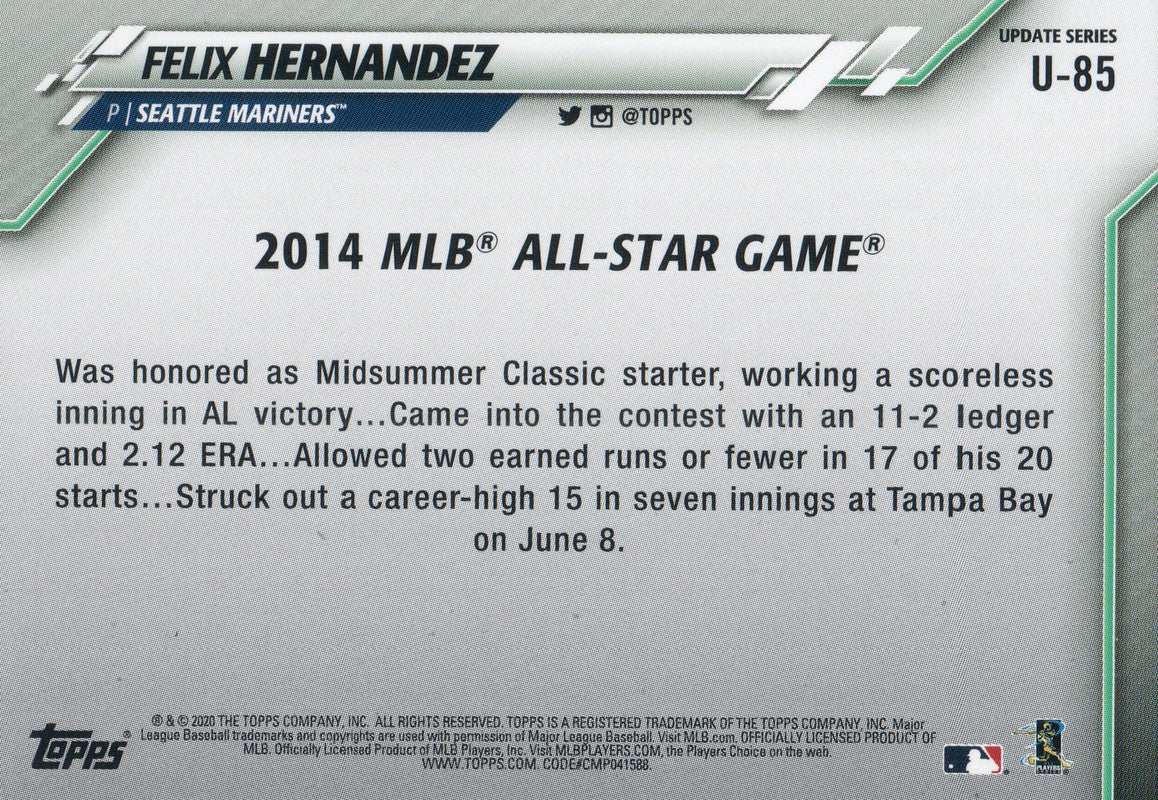 U-85 Felix Hernandez 2014 MLB All Star Game Seattle Mariners 2020 Topps Update Baseball Card